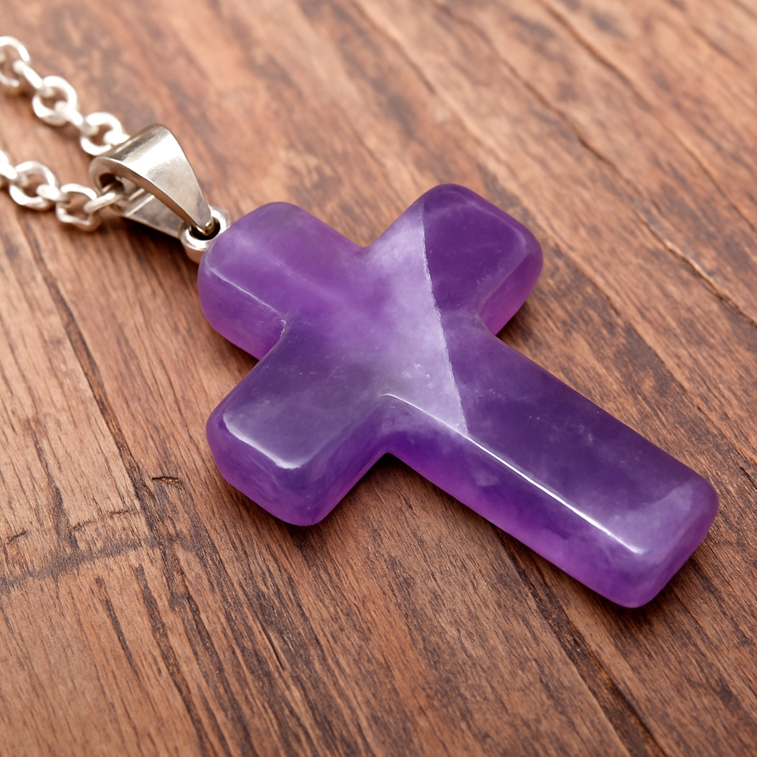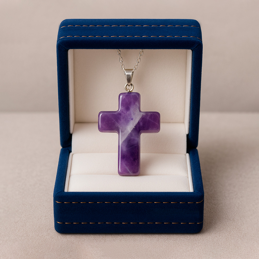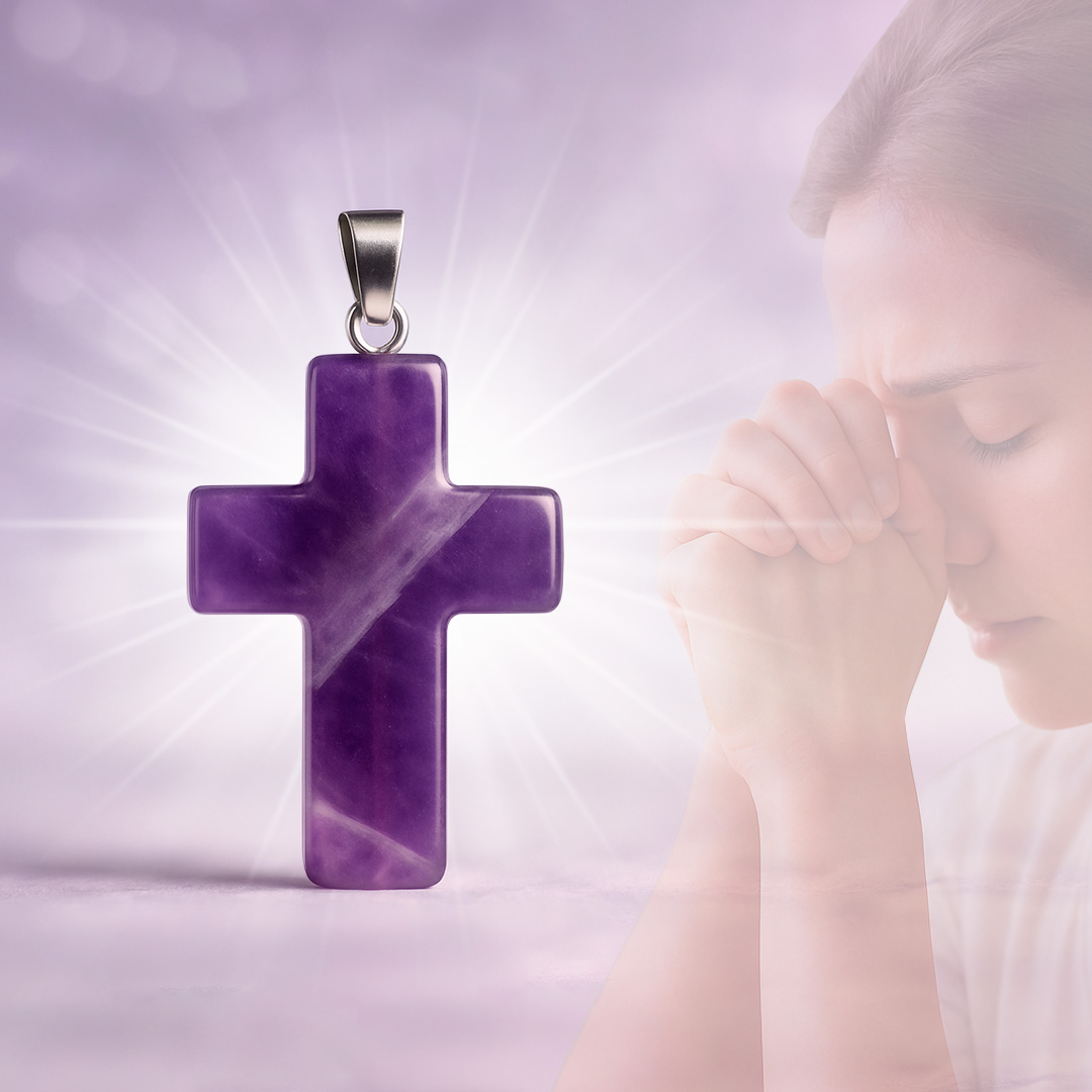 The cross represents faith and divine protection, while amethyst is often used to ease anxiety, promote clarity, and support spiritual growth. Together, they bring comfort and healing to those who carry it.